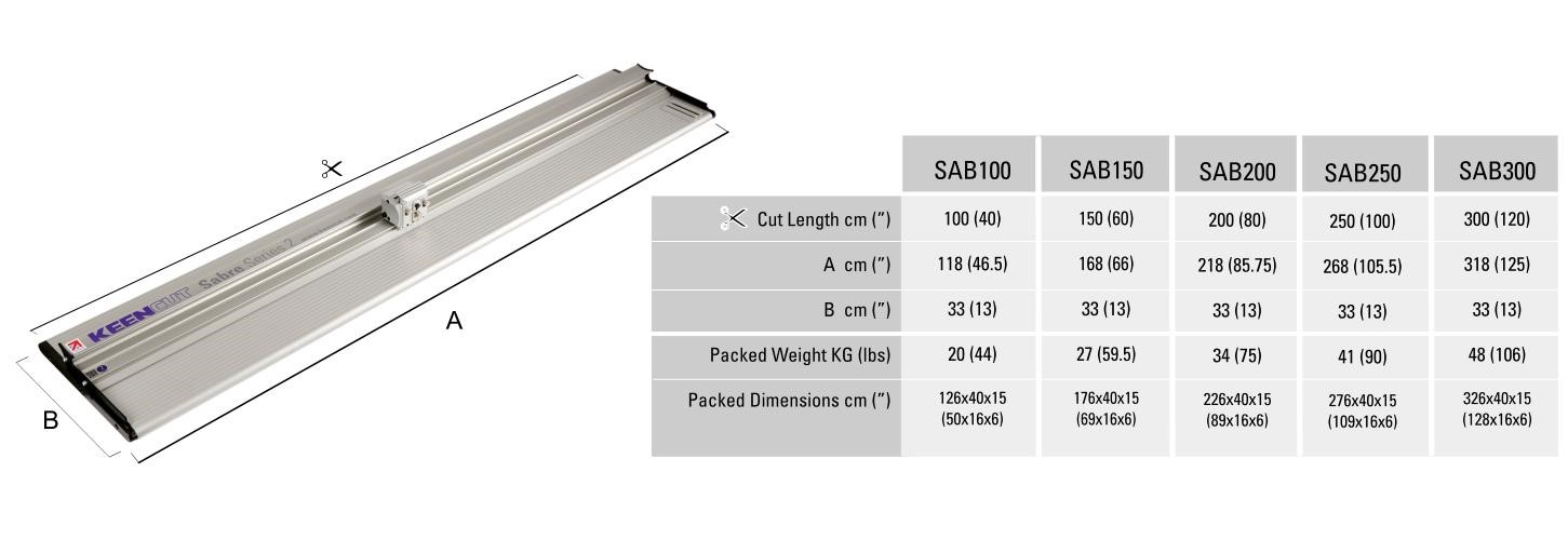 Keencut Sabre Series 2Sabre Series 2 is an out of the box ready to use solution for medium-volume cutting of materials up to 13mm thick. It’s perfect for the print shop, workshop, studio, architects’ practice, or educational institutions. Floating, self-adjusting hinges automatically adapt for stable lay-flat cutting and offer the opportunity to cut wider sheet materials. The Sabre has 3 blades as standard; Graphik Blade Holder - Designed for the signmaker. Can cut tougher materials up to 13mm thick and score acrylic by running the blade backwards Rotary Blade Holder - Cold cutting of textiles and other delicate materials and ideal for trimming thin strips from banners. Mediaum Duty Blade - Uses standard utility blades for general piurpose economical cutting up to a depth of 10mm Space-saving and fully mobile, the Sabre can be mounted on an optional stand and fitted with a waste catcher and roll feed. The safety features make it ideally suited for use by inexperienced operators in any environment. Features